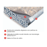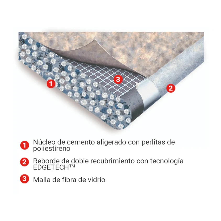 La placa de cemento PermaBase™ se compone de un núcleo de cemento aligerado reforzado con dos capas de malla de fibra de vidrio, proporcionando una superficie excepcionalmente duradera y resistente a la humedad.