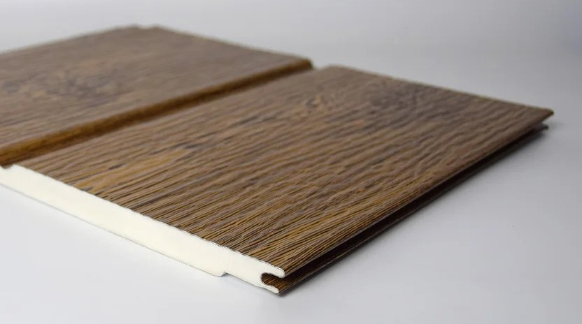 El Siding Metálico está compuesto por: En el exterior una lamina metálica que contiene el diseño y color. En su centro una capa de espuma de poliuretano (PU) inyectada que entrega aislación térmica y acústica y en su capa interior, una membrana de aluminio que ayuda a evitar el paso de humedad y refuerza la aislación térmica.